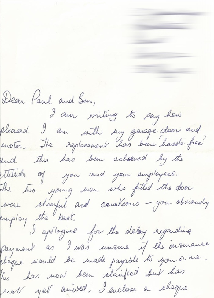 I am writing to say how pleased I am with my garage doors and motor. The replacement has been hassle free and this has been achieved bu the attitude of you and your employees. The two young men who fitted the door were cheerful and courteous - you obviously employ the best.